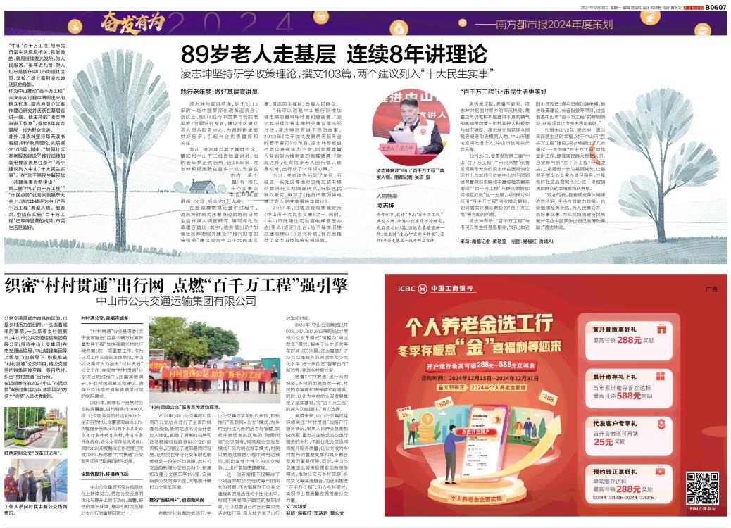 人物档案 凌志坤 今年89岁,获评“中山‘百千万工程’”典型人物。他潜心伏案作理论研究,先后撰文103篇,活跃在基层宣讲一线,他主持“凌志坤宣讲工作室”,连续8年奔走基层一线为群众宣讲。 “