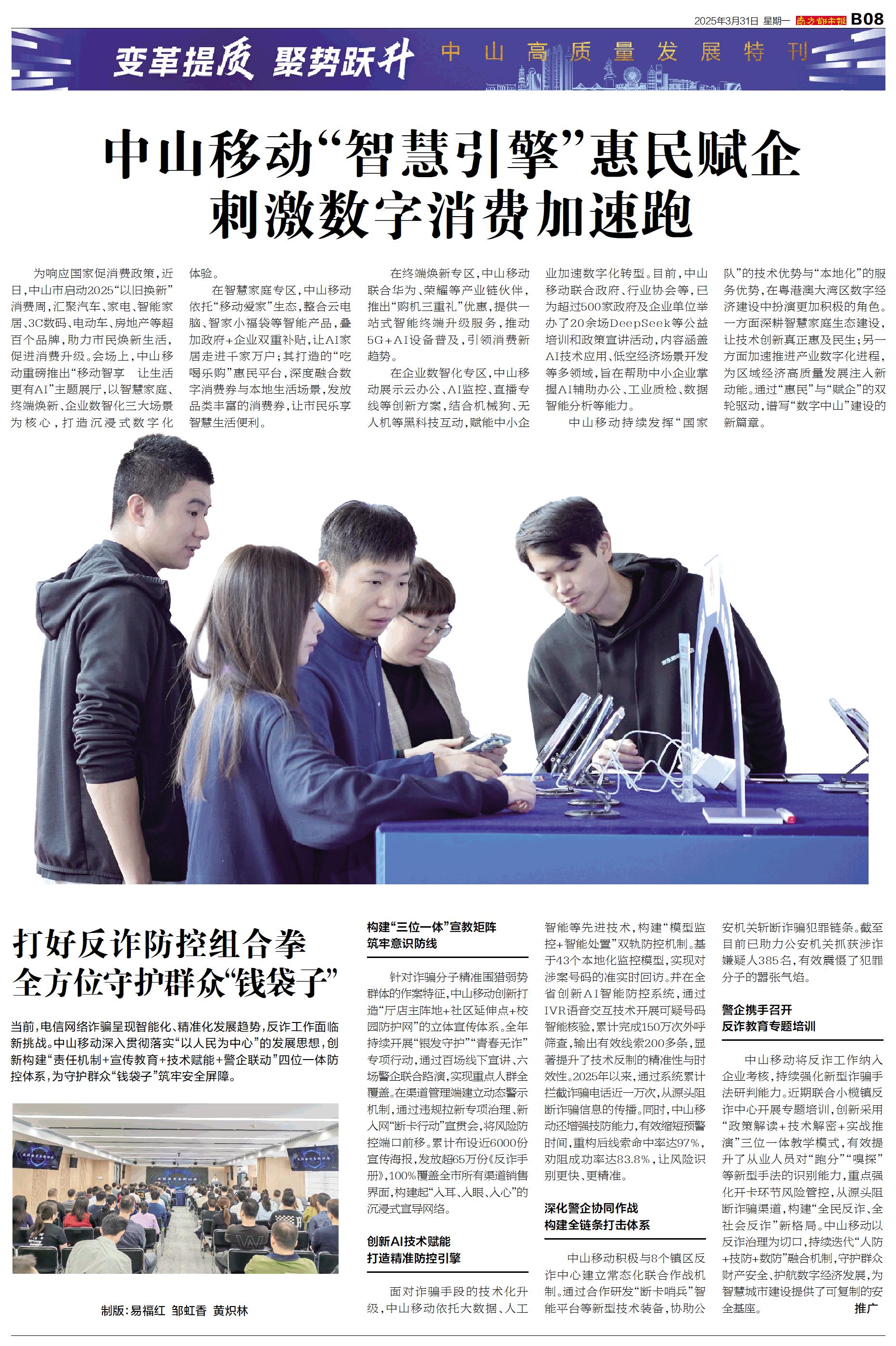 当前,电信网络诈骗呈现智能化、精准化发展趋势,反诈工作面临新挑战。中山移动深入贯彻落实“以人民为中心”的发展思想,创新构建“责任机制+宣传教育+技术赋能+警企联动”四位一体防控体系,为守护群众“钱