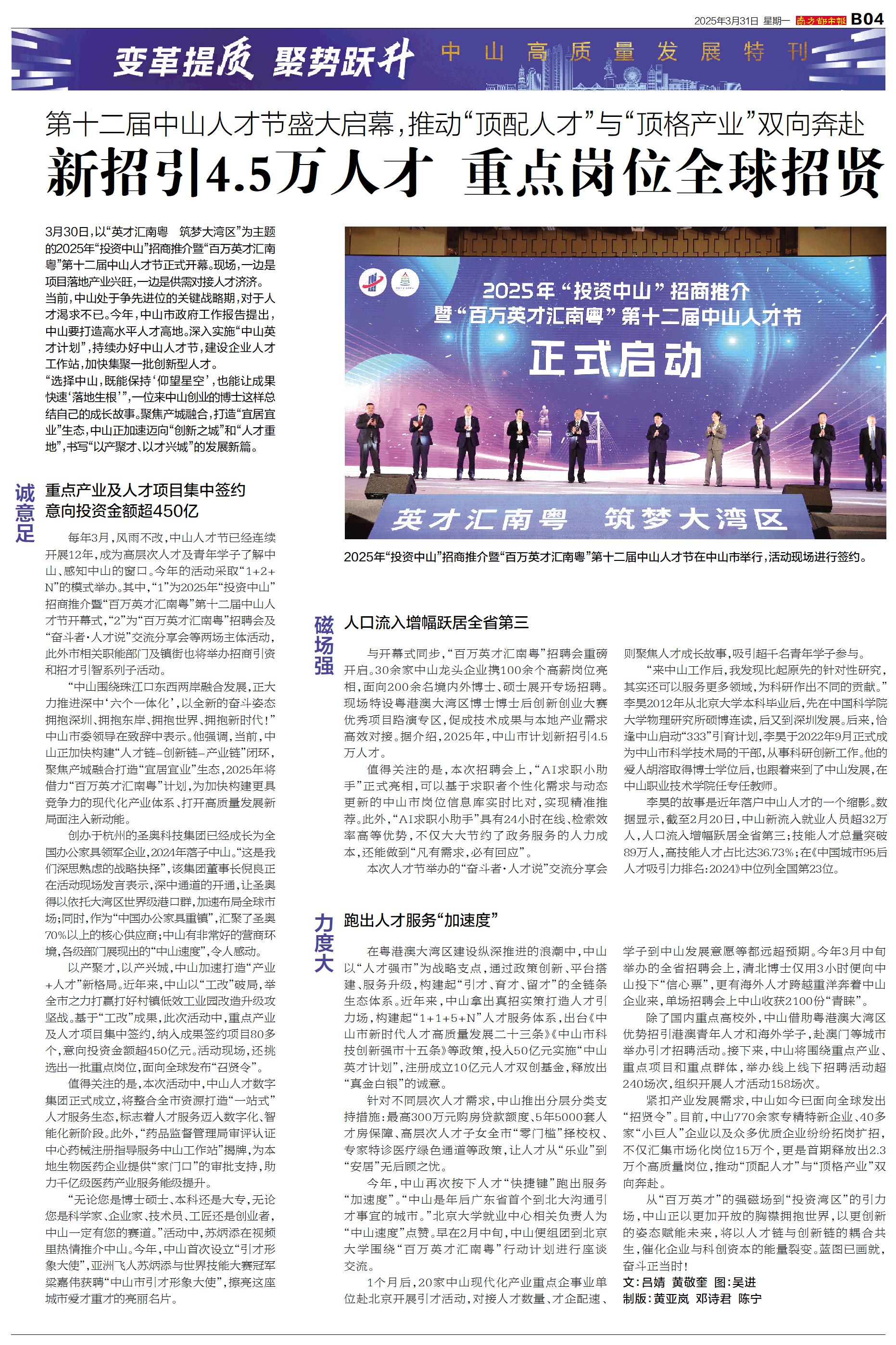 3月30日,以“英才汇南粤 筑梦大湾区”为主题的2025年“投资中山”招商推介暨“百万英才汇南粤”第十二届中山人才节正式开幕。现场,一边是项目落地产业兴旺,一边是供需对接人才济济。 当前,中山处