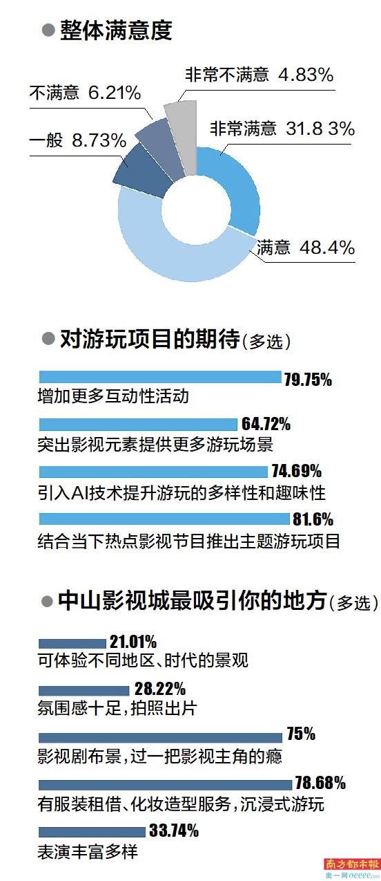 在受访者对中山影视城的期待和建议中,69.72%的受访者期待或建议突出影视元素提供更多游玩场景;81.6%的受访者表示期待或建议结合当下热门影视节目推出主题游玩项目。在影视主题活动强烈参与感调查中,59.66%的参与者表示对影视主题活动有强烈的参与感。值得注意的是,在中山影视城之于游客最大吸引力调查中,沉浸式游玩服务受到78.68%受访者的青睐。这也说明了游客对于“影视”“沉浸式”游玩项目更为期待。