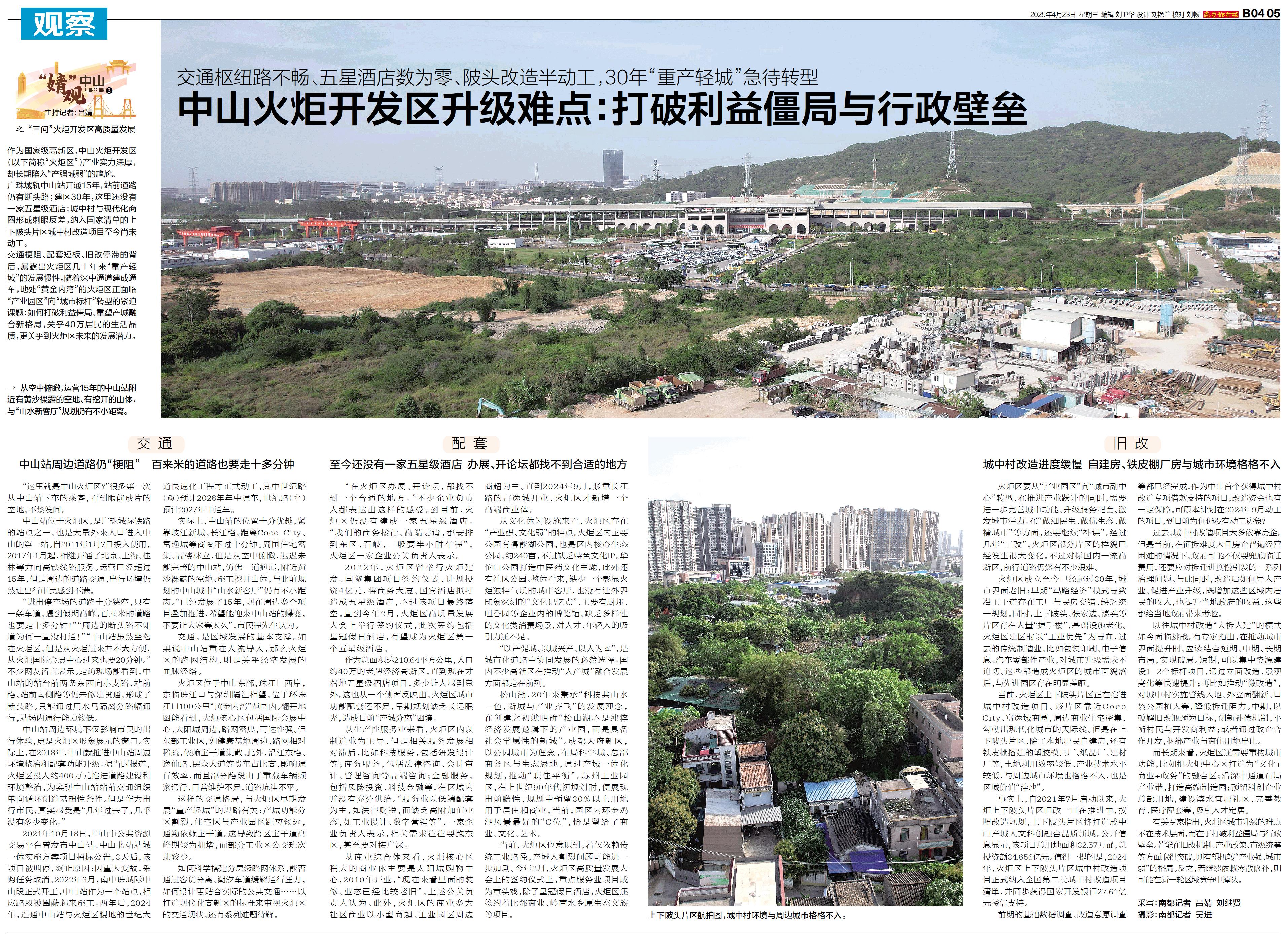 作为国家级高新区,中山火炬开发区(以下简称“火炬区”)产业实力深厚,却长期陷入“产强城弱”的尴尬。 广珠城轨中山站开通15年,站前道路仍有断头路;建区30年,这里还没有一家五星级酒店;城中村与现