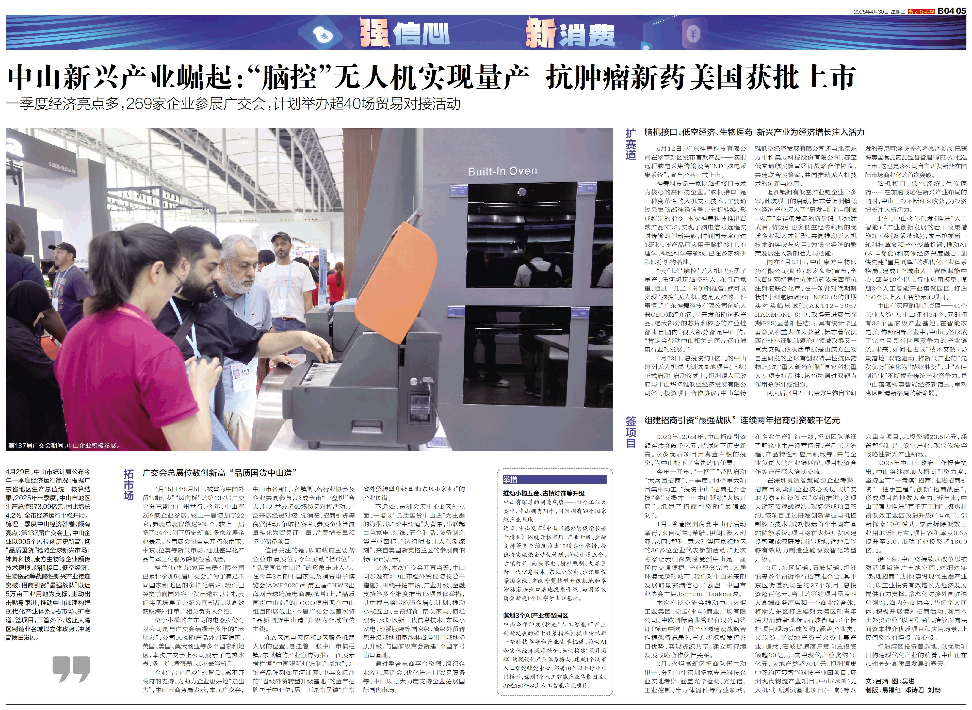 中山新兴产业崛起:“脑控”无人机实现量产 抗肿瘤新药美国获批上市