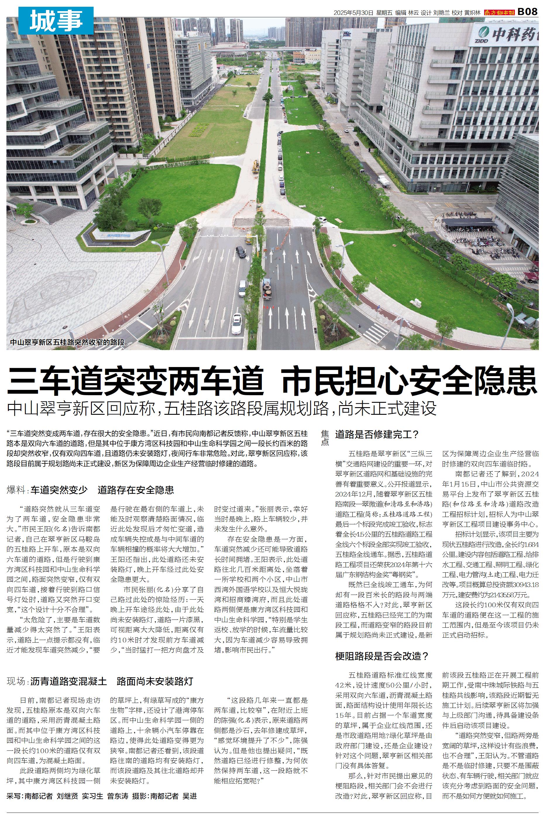 “三车道突然变成两车道,存在很大的安全隐患。”近日,有市民向南都记者反馈称,中山翠亨新区五桂路本是双向六车道的道路,但是其中位于康方湾区科技园和中山生命科学园之间一段长约百米的路段却突然收窄,仅有