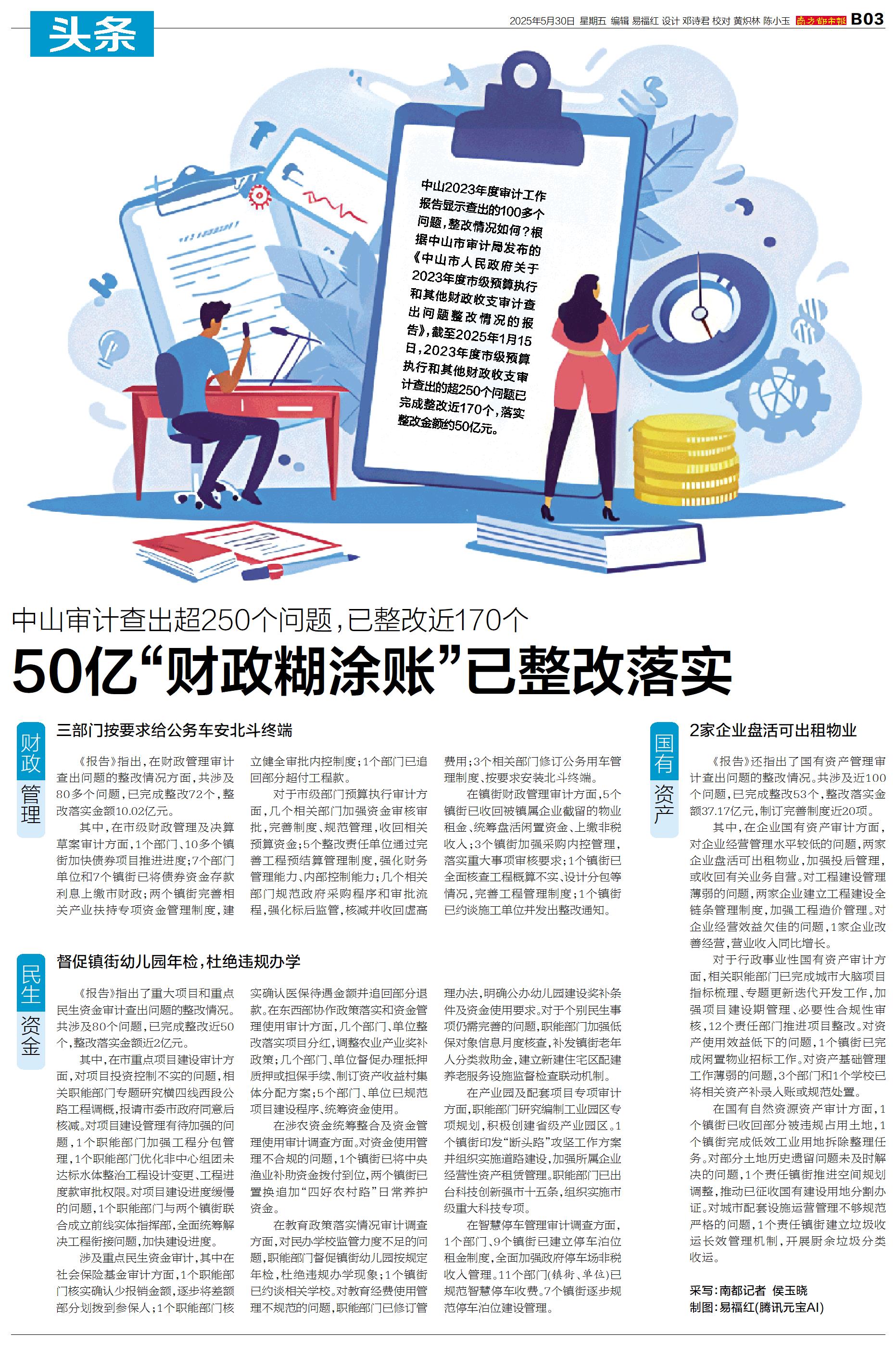 中山2023年度审计工作报告显示查出的100多个问题,整改情况如何?根据中山市审计局发布的《中山市人民政府关于2023年度市级预算执行和其他财政收支审计查出问题整改情况的报告》,截至2025年1月