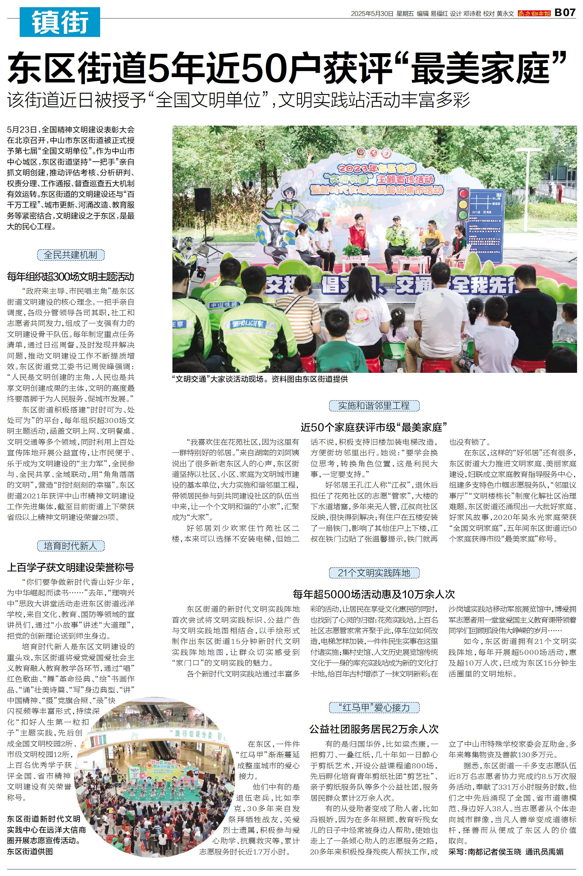 5月23日,全国精神文明建设表彰大会在北京召开,中山市东区街道被正式授予第七届“全国文明单位”。作为中山市中心城区,东区街道坚持“一把手”亲自抓文明创建,推动评估考核、分析研判、权责分理、工作通报