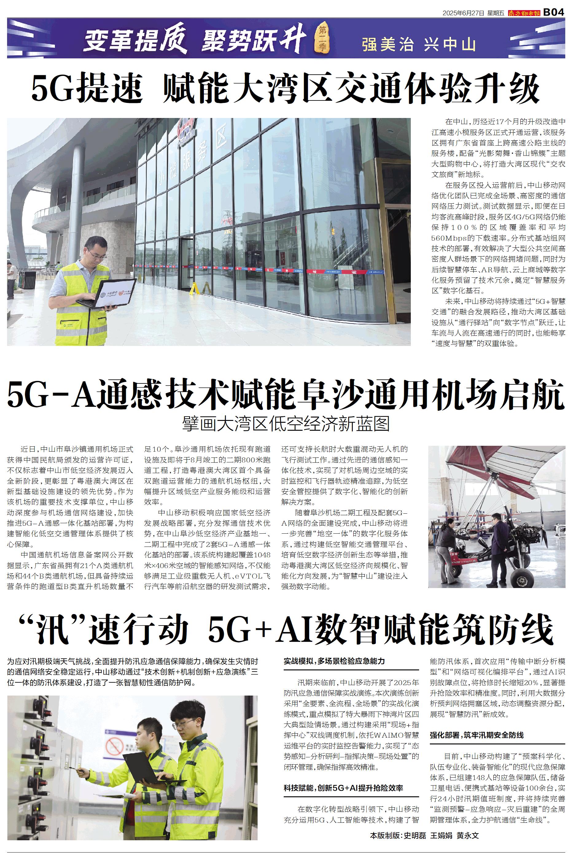 为应对汛期极端天气挑战,全面提升防汛应急通信保障能力,确保发生灾情时的通信网络安全稳定运行,中山移动通过“技术创新+机制创新+应急演练”三位一体的防汛体系建设,打造了一张智慧韧性通信防护网。 实