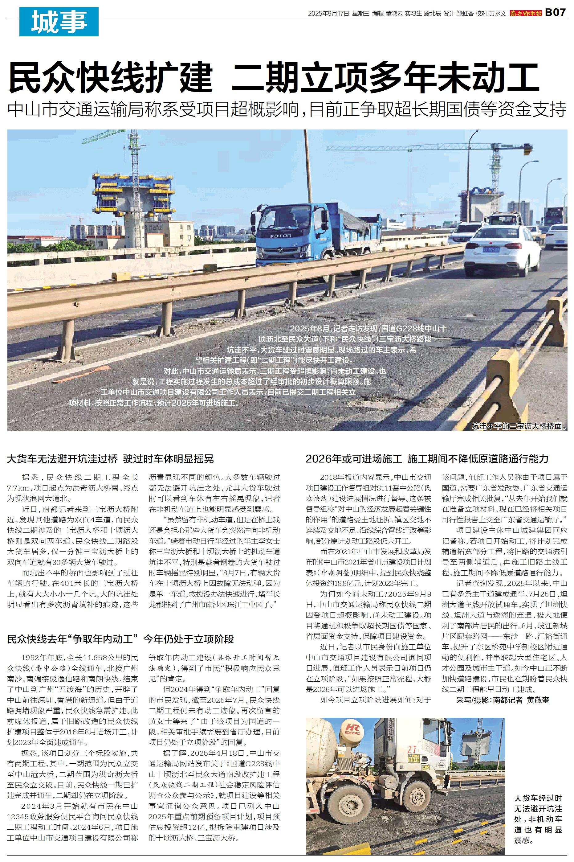 2025年8月,记者走访发现,国道G228线中山十顷沥北至民众大道(下称“民众快线”)三宝沥大桥路段坑洼不平,大货车驶过时震感明显。现场路过的车主表示,希望相关扩建工程(即“二期工程”)能尽快开工