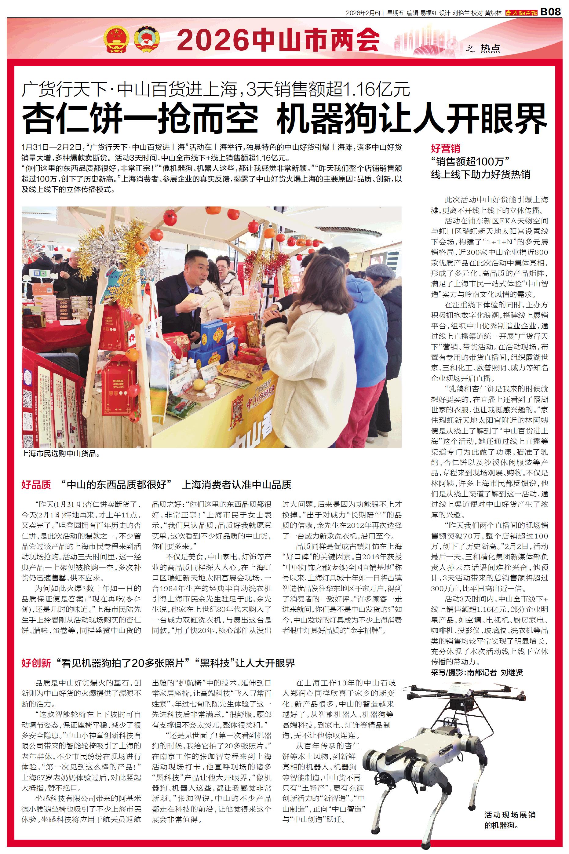 热点 1月31日—2月2日,“广货行天下·中山百货进上海”活动在上海举行,独具特色的中山好货引爆上海滩,诸多中山好货销量大增,多种爆款卖断货。活动3天时间,中山全市线下+线上销售额超1.16亿元