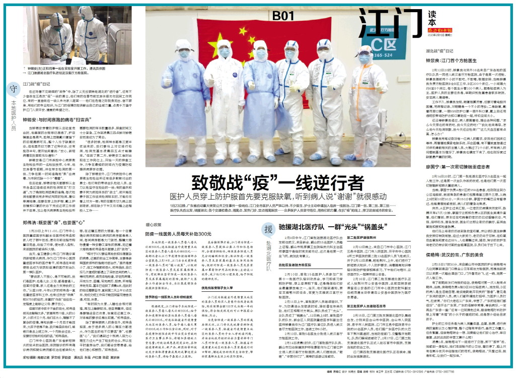 1月23日晚,广东省启动重大突发公共卫生事件一级响应,江门全市医护人员严阵以待,不少医生、护士主动申请加入临床一线救治。江门第一批、第二批、第三批……医疗队先后出发,驰援湖北;各个交通检查点、隔离点、