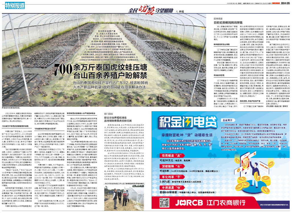 新冠肺炎疫情严重后,全国人大常委会发布禁食、禁止非法养育野生动物等决定,江门本地养殖的泰国虎纹蛙、蛇类、鹧鸪、鹌鹑等的销售受到影响,一批成品蛙类、蛇类和禽类压塘、压场,不能销售。其中,江门台山市的泰国