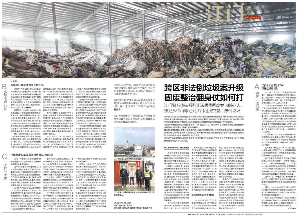 2020年3月,江门企业陆续复工复产。然而,江门市蓬江区荷塘镇、杜阮镇、棠下镇,新会区大泽镇、鹤山市沙坪街道、共和镇等区市一些厂房企业发现,原本空置的厂房被倾倒了大量工业垃圾,江门市公安机关接到类似报