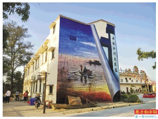 乘船过渡,在石板沙的阡陌小巷中穿行,在路标的指示下,不一会儿便可找到石板沙时光民宿。远远看去,这家由旧学校改建的民宿虽然仍保留着学校教学楼的外形,但却散发着独特的疍家文化的气息。民宿四周以仿古青砖作围栏,围栏上除了有民宿的标识外,还有疍家文化墙绘,既有疍家特色,又有复古味道。走进民宿,一幅巨型墙绘映入眼帘,这幅墙绘生动地绘制了疍家人在落日下撒网打鱼的场景,让人有种放松闲适的感觉,墙绘下方还放置了渔船,引得旅客们纷纷在渔船旁、墙绘下拍照“打卡”。