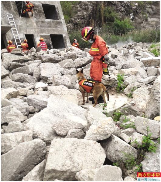 江门搜救犬正在工作。