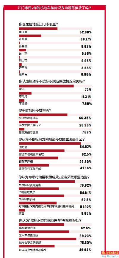 那么,对于机动车按标识方向规范停放的要求,江门市民有什么样的看法,在日常生活中,又是怎么做的呢?南都记者通过网络调查获悉,在短短的三天时间里,收到近两百份调查数据,根据调查数据显示,75%的受访者认为在江门市区机动车不按标识方向规范停放的情况常见;而在“你认为市民不按标识方向规范停放的主要原因是什么?”的选项中,超过80%选择是图方便;在你认为“按标识方向规范停车”有哪些好处?的选项中,近80%的受访者表示,城市会更文明美观。