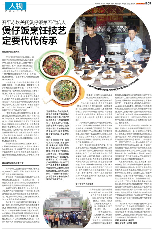 “我们要求,子女后代至少要有一人学习烹饪煲仔饭。”赤坎关氏煲仔饭第五代传人关永衡、关永君表示,煲仔饭烹饪技艺一定要一代代传承下去。据了解,为确保煲仔饭技艺代代传承,关家也在积极将赤坎煲仔饭烹饪技艺申报开平市县级非物质文化遗产。