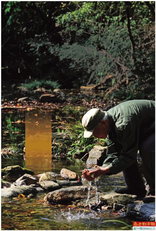 鹤山市宅梧镇,叶伯巡山归来,用清澈的溪水洗了把脸。远处,红红的枫叶铺满山路。时代变迁,城镇化发展,村里人都走向了城市,山村变得更加寂静。 南都记者 谭伟山 摄