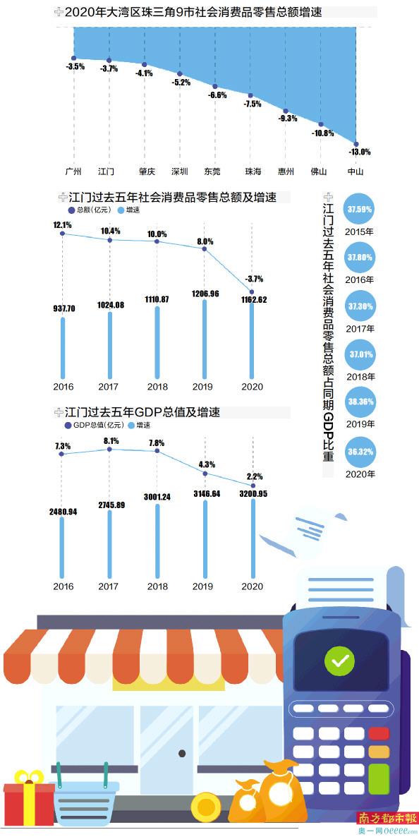 数据背后,折射出江门内需市场与经济、GDP不同步,发展尚不均衡的问题。对照美、英、德、日等发达国家消费占GDP比重最低超过60%的指标,江门内需市场仍大有可为,未来的提升空间、挖掘潜力巨大。