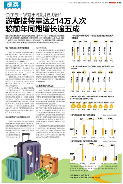 南都记者梳理粤港澳大湾区内地各城陆续发布的2021年“五一”假期旅游经济表现数据发现,今年江门旅游市场表现亮眼,5月1日至5日,全市共接待游客214.01万人次,揽金11.94亿元,比2019年同