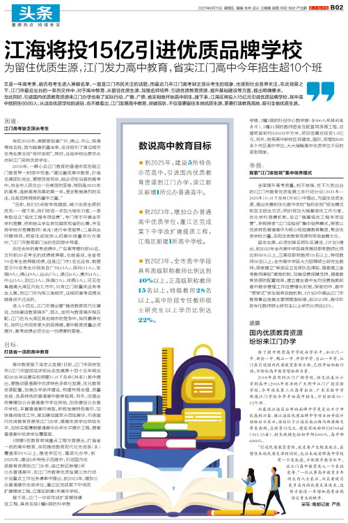 到2025年,建设5所特色示范高中,引进国内优质教育资源到江门办学,滨江新区新增1所公办普通高中。