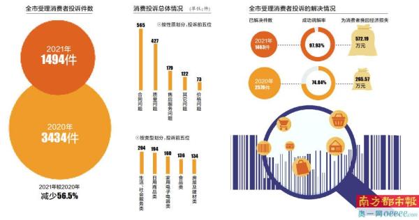 《报告》指出,2021年度,江门市各级消委会受理消费者来访、来信、网络等投诉1494宗,消费投诉总量较2020年度的3434宗下降56.5%。
