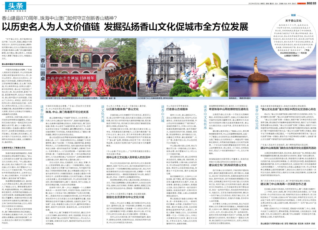 “对于香山文化,我们做得还远远不够。”2022年,是香山建县870周年的日子。如何守正创新香山精神?如何复兴香山文化从而推动社会经济发展?珠海中山澳门多位嘉宾建言献策,他们提出:要让更多人、尤其是