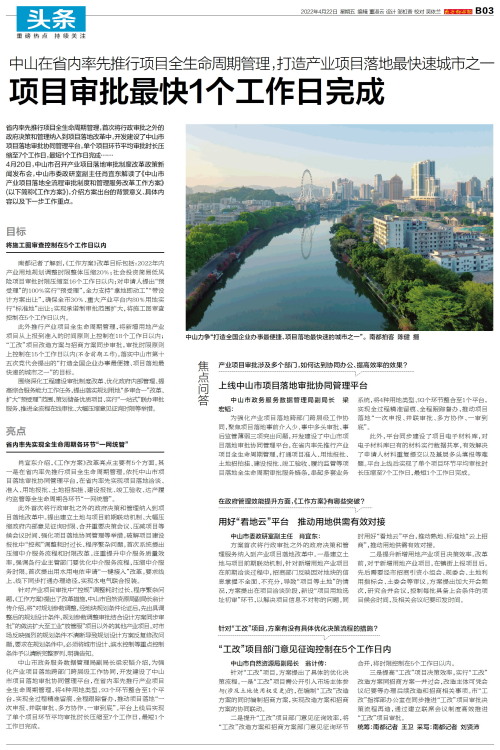 省内率先推行项目全生命周期管理,首次将行政审批之外的政府决策和管理纳入到项目落地改革中,开发建设了中山市项目落地审批协同管理平台,单个项目环节平均审批时长压缩至7个工作日,最短1个工作日完成……4