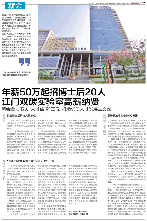近日,一则招聘信息引发广泛关注:坐落于江门市新会区的江门双碳实验室发布招聘信息,计划招聘博士后研究人员20名,年薪50万元起。高薪纳贤的背后,折射出全市、全区对人才工作的重视和力度。当前,新会区正