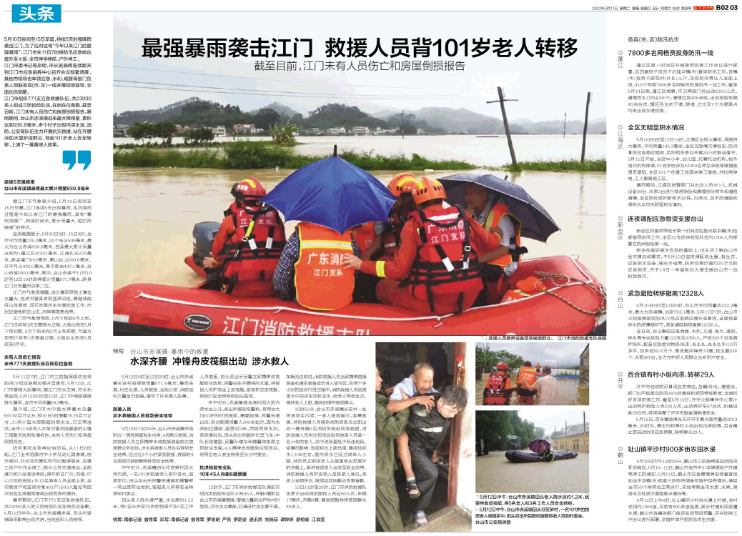 江门市组织771支应急救援队伍,共23000多人组成三防抢险队伍,在岗在位备勤。截至目前,江门未有人员伤亡和房屋倒损报告。暴雨期间,台山市赤溪镇迎来最大降雨量,累积达到930.8毫米,多个村子出现内涝水浸,消防、公安等队伍全力开展抗灾救援,站在齐腰深的水里护送群众,背起101岁老人安全转移,上演了一幕幕感人故事。