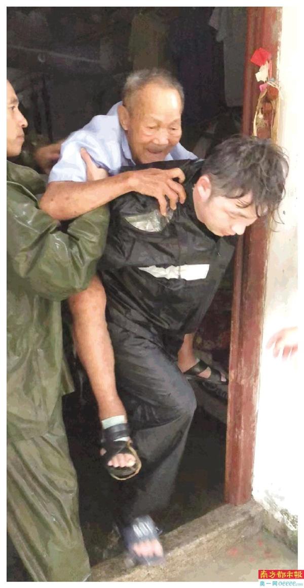 中午时分,赤溪镇田头圩茭笋村因大雨内涝,一名101岁独居老人家中进水,被困家中,田头派出所民警陈建国和辅警郭一鸣立即前往救助,背起老人将其安全转移到村委会。