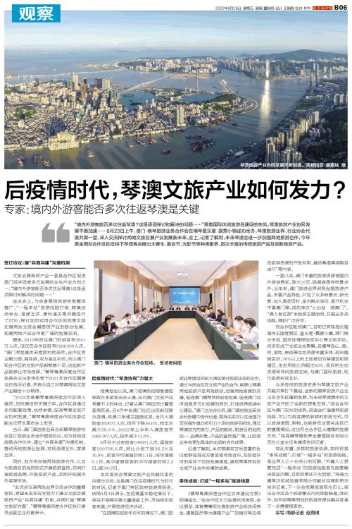 “境内外游客能否多次往返琴澳?这是亟须探讨和解决的问题……“乘着国际休闲旅游岛建设的东风,琴澳旅游产业协同发展不断加速……8月23日上午,澳门·横琴旅游业务合作会在横琴星乐度·露营小镇成功举办,琴