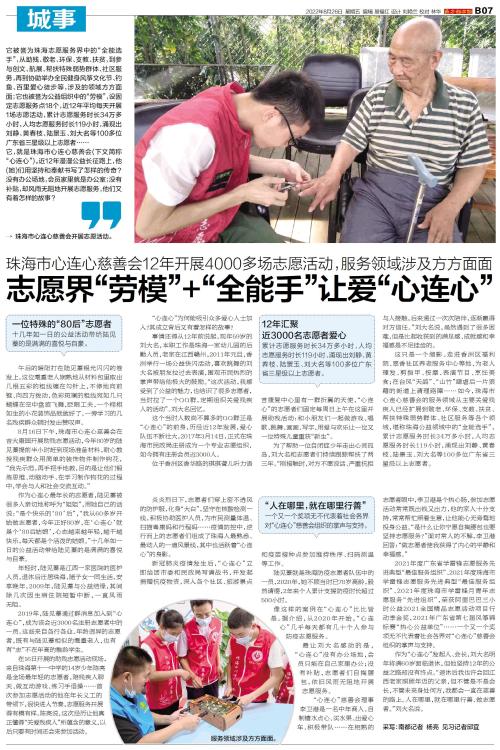 珠海市心连心慈善会开展志愿活动。 服务领域涉及方方面面。 它被誉为珠海志愿服务界中的“全能选手”,从助残、敬老、环保、支教、扶贫,到参与创文、航展