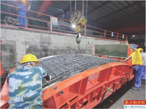 3. 深江铁路万顷沙施工现场,工人进行管片钢筋笼吊装。 通讯员供图