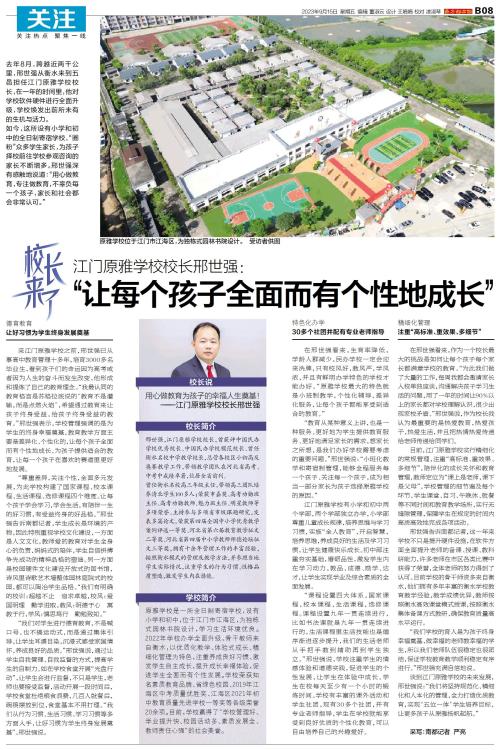 校长简介 邢世强,江门原雅学校校长,曾获评中国民办学校优秀校长、中国民办学校模范校长、曾任衡水名校中学教学校长,总管各校区小初高及奥赛教学工作,带领教学团队在河北省高考、中考中成绩卓著,位居全省