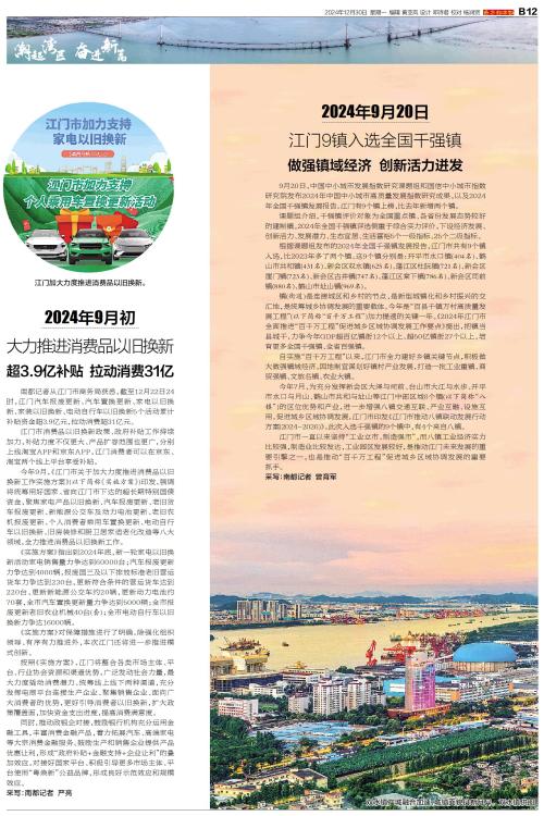 2024年9月初 南都记者从江门市商务局获悉,截至12月22日24时,江门汽车报废更新、汽车置换更新、家电以旧换新、家装以旧换新、电动自行车以旧换新5个活动累计补贴资金超3.9亿元,拉动消费超3