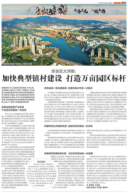 强镇富民兴村,促进城乡协调发展。今年以来,大泽镇深入落实江门市委“八镇联动”工作部署,加速推进省级“百县千镇万村高质量发展工程”典型镇、村建设,全力打造新能源引领万亩园区建设的主阵地,红木之乡和园