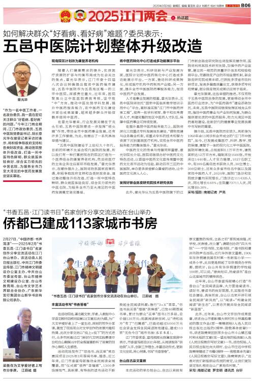 “作为一名中医工作者,一名政协委员,我一直在密切关注群众‘好看病、看好病’的问题。”今年江门两会期间,江门市政协委员,五邑中医院党委副书记、院长章光华在接受记者采访时表示,将积极争取政府支持和各类财政资金,推动医院整体升级改造,打造一所中医特色鲜明、群众就医体验良好、综合实力领先的中医名院,为服务全市乃至大湾区的中医药发展奠定坚实基础。