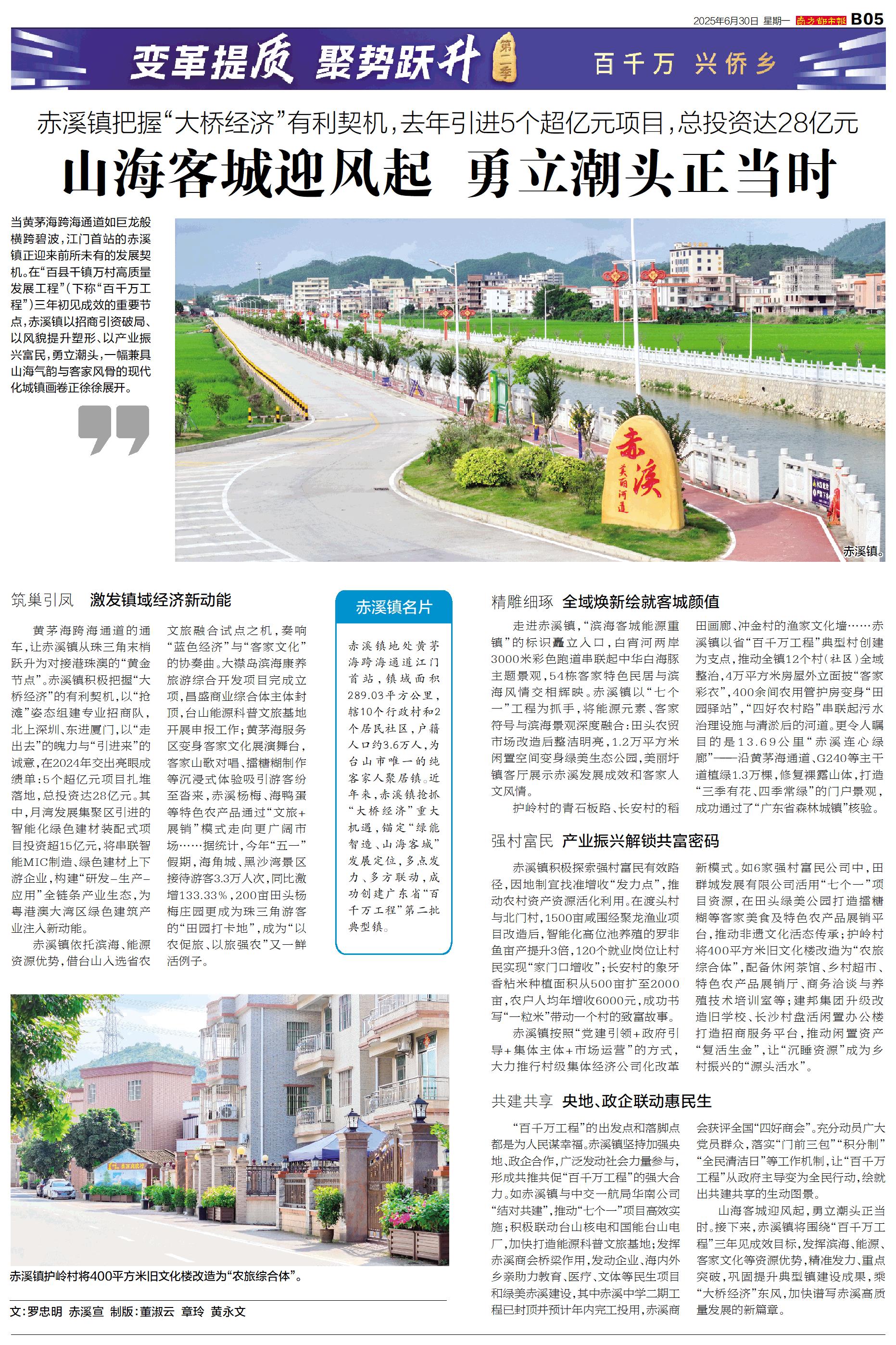 当黄茅海跨海通道如巨龙般横跨碧波,江门首站的赤溪镇正迎来前所未有的发展契机。在“百县千镇万村高质量发展工程”(下称“百千万工程”)三年初见成效的重要节点,赤溪镇以招商引资破局、以风貌提升塑形、以产