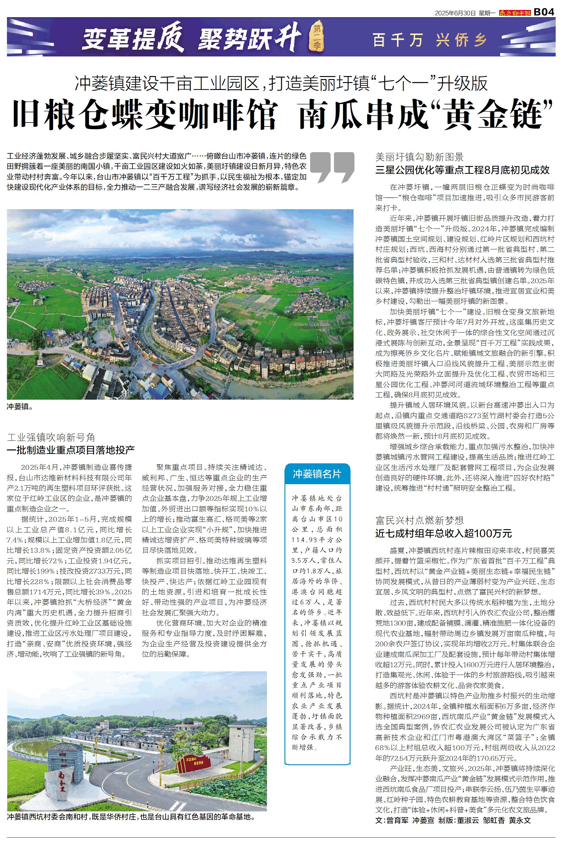 工业经济蓬勃发展、城乡融合步履坚实、富民兴村大道宽广……俯瞰台山市冲蒌镇,连片的绿色田野拥簇着一座美丽的南国小镇,千亩工业园区建设如火如荼,美丽圩镇建设日新月异,特色农业带动村村奔富。今年以来,台