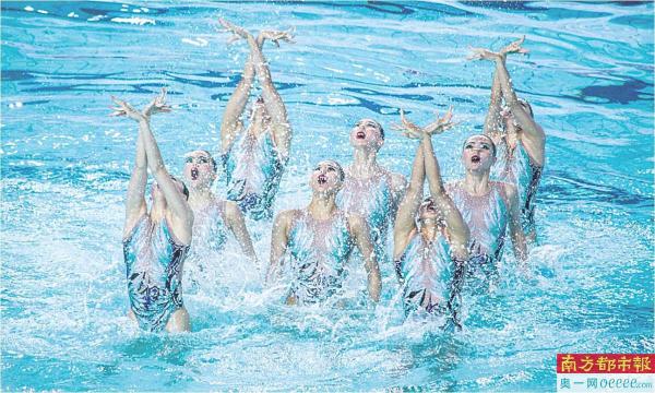 江门体育中心游泳馆正在举办花样游泳赛事。