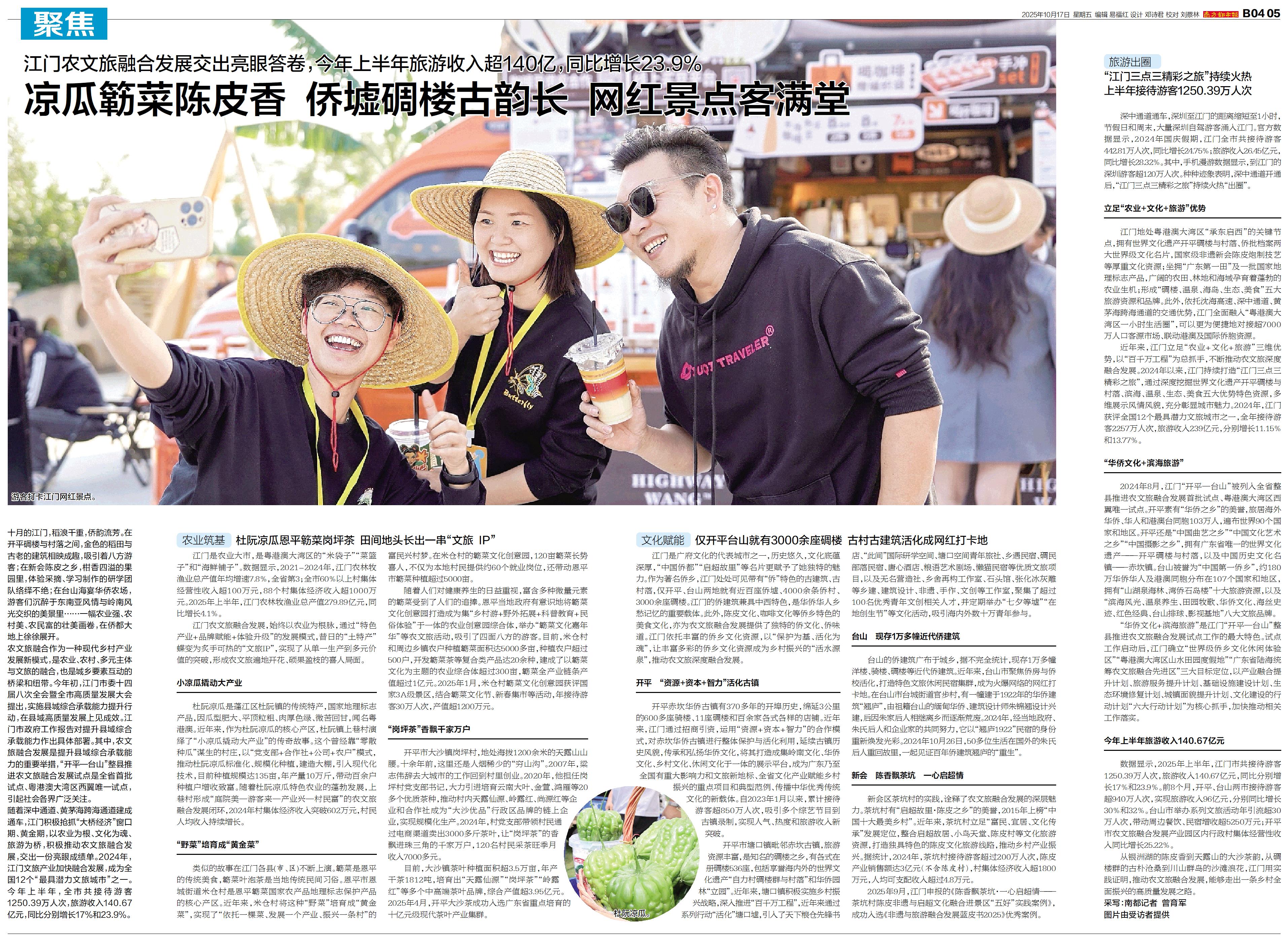 十月的江门,稻浪千重,侨韵流芳。在开平碉楼与村落之间,金色的稻田与古老的建筑相映成趣,吸引着八方游客;在新会陈皮之乡,柑香四溢的果园里,体验采摘、学习制作的研学团队络绎不绝;在台山海宴华侨农场,游