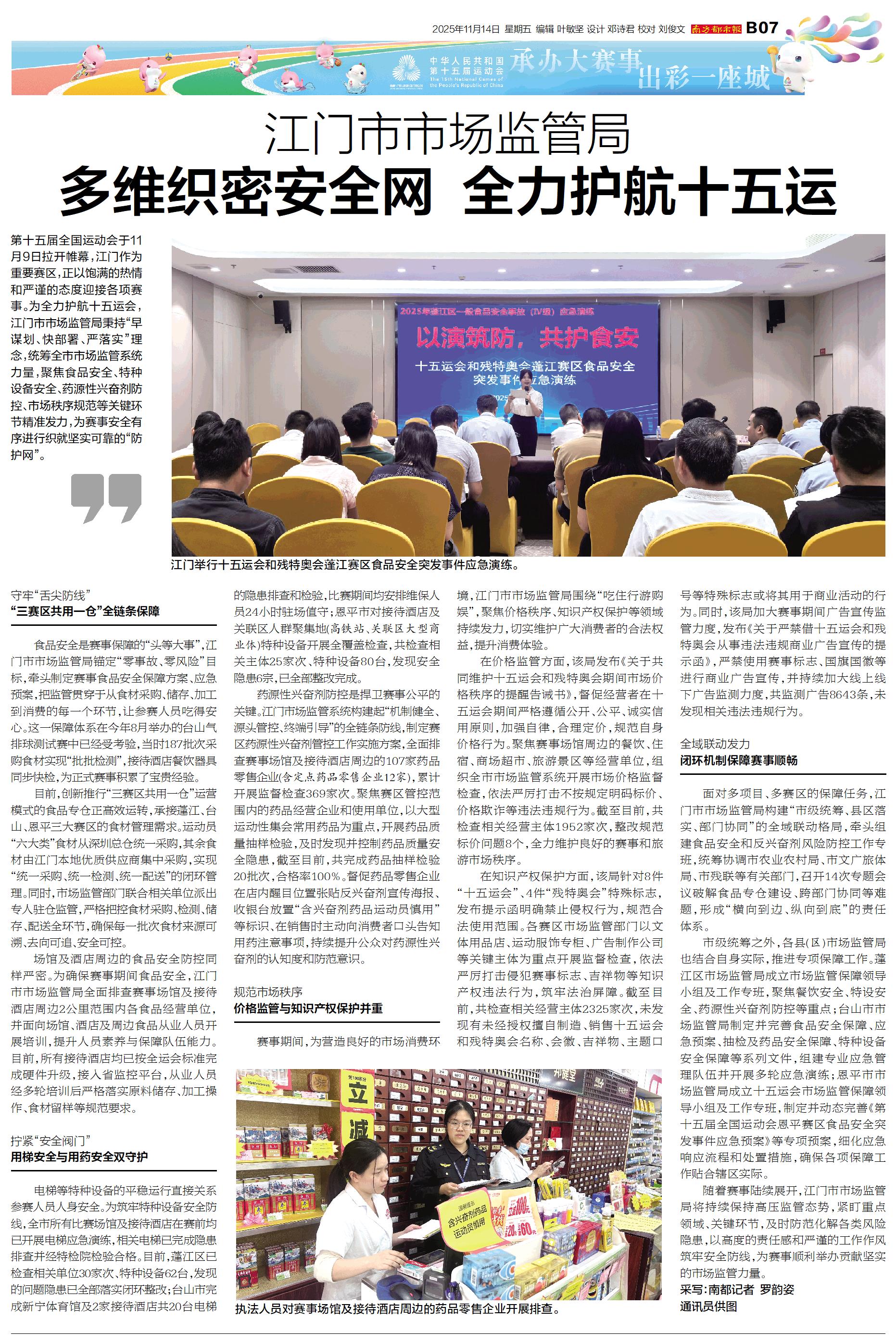 承办大赛事 出彩一座城 第十五届全国运动会于11月9日拉开帷幕,江门作为重要赛区,正以饱满的热情和严谨的态度迎接各项赛事。为全力护航十五运会,江门市市场监管局秉持“早谋划、快部署、严落实”理念