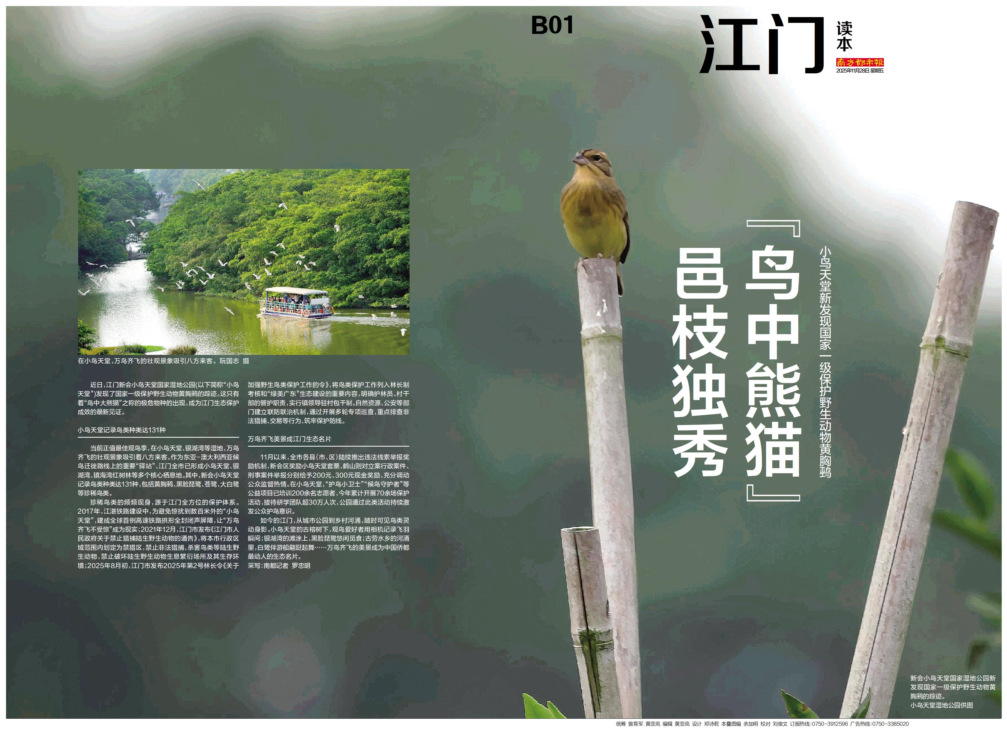 近日,江门新会小鸟天堂国家湿地公园(以下简称“小鸟天堂”)发现了国家一级保护野生动物黄胸鹀的踪迹。这只有着“鸟中大熊猫”之称的极危物种的出现,成为江门生态保护成效的最新见证。 小鸟天堂记录鸟
