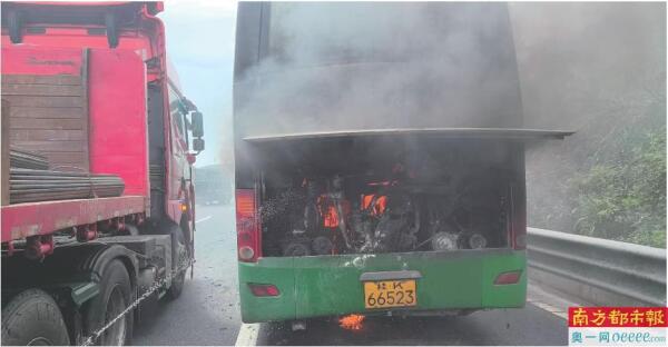 2025年8月25日,李建正带着7岁多和9岁的两个女儿回老家探亲,行驶至汕湛高速茂名段时,前方一辆满载乘客的大客车尾部突然冒出黑烟,火苗迅速蹿起。“发动机就在尾部,暑假返程高峰,满车都是老人小孩,一旦火势蔓延或刹车故障,几十个家庭就毁了!”李建的大脑瞬间紧绷。