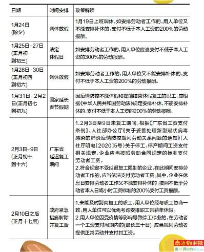 广东省延迟复工期间的工资待遇如何支付呢?政策指引解释,2月3日至9日未复工期间,根据《广东省工资支付条例》《关于妥善处理新型冠状病毒感染的肺炎疫情防控期间劳动关系问题的通知》关于停工、停产期间工资支付相关规定,企业应当按照劳动合同规定的标准支付劳动者工资。