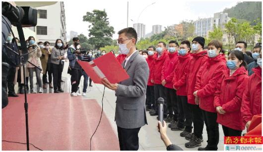2月11日上午,来自全市多家医院的17名医护骨干人员,统一身着红色队服,在珠海市卫健局大楼下紧急集结,宣誓出发。市委副书记、市长、市新冠肺炎疫情防控指挥部常务副总指挥姚奕生前来为他们送行,嘱咐医疗队不辱使命、平安归来。