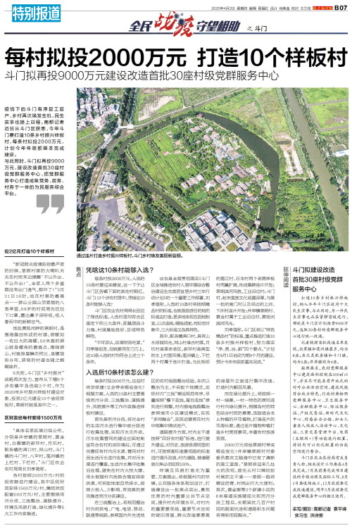 疫情下的斗门有序复工复产,乡村再次焕发生机,民生实事也提上日程。南都记者近日从斗门区获悉,今年斗门要打造10条乡村振兴样板村,每条村拟投2000万元,计划今年年底前基本完成建设。