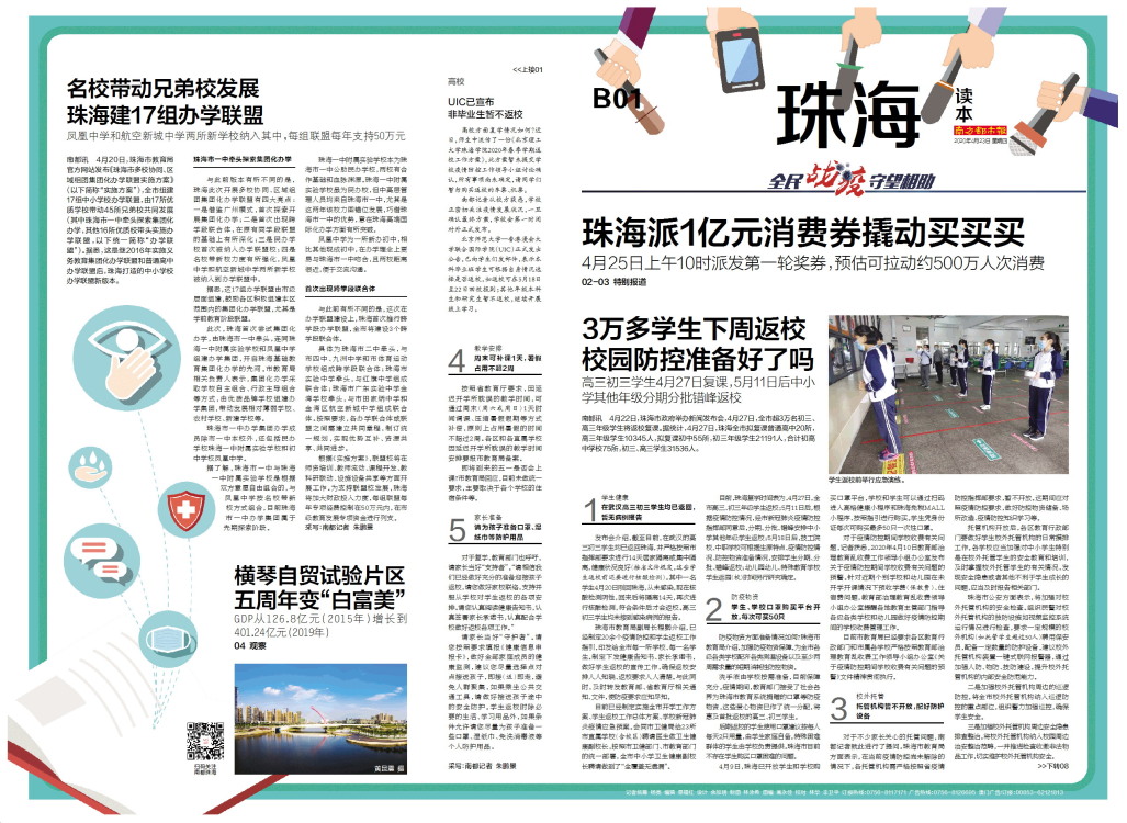 南都讯 4月22日,珠海市政府举办新闻发布会,4月27日,全市超3万名初三、高三年级学生将返校复课。据统计,4月27日,珠海全市拟复课普通高中20所,高三年级学生10345人,拟复课初中55所,初三年