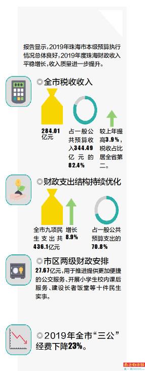 《报告》显示,2019年珠海市本级预算执行情况总体良好,2019年度珠海财政收入平稳增长,收入质量进一步提升,全市税收收入284.01亿元,占一般公共预算收入344.49亿元的82.4%,较上年提高3.9%,税收占比居全省第二。财政支出结构持续优化,发展成果惠及更多群众,基本公共服务保障标准进一步提高,全市九项民生支出共436.1亿元、增长8.9%,占一般公共预算支出的70.8%,市区两级财政安排27.67亿元用于推进提供更加便捷的公交服务、开展小学生校内课后服务、建设长者饭堂等十件民生实事,2019年全市“三公”经费下降23%。