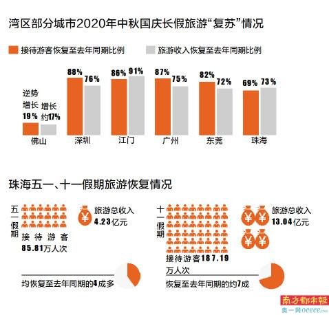 深圳、江门、广州、东莞旅游业的复苏势头也明显比珠海快,接待游客量分别恢复至去年同期的82%-88%之间,旅游收入分别恢复至去年同期的72%-91%。深圳今年中秋国庆接待游客546.1万,恢复至去年同期的88%;实现旅游收入53.4亿元,恢复至去年同期的约76%;而珠海接待游客仅恢复到去年同期的69%,相差近18个百分点,旅游收入恢复约73%,相差约3个百分点。