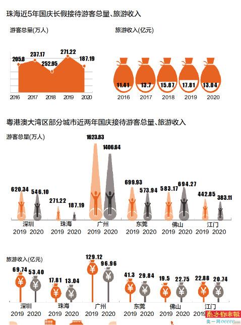 南都记者梳理公开报道,对粤港澳大湾区部分城市今年和去年的国庆假期的旅游数据进行整理发现,相比于广州、深圳、东莞、佛山等城市,珠海无论接待游客、旅游总收入的规模、体量,还是与去年同期数据相比较,“复苏”排名处于“落后”位置。
